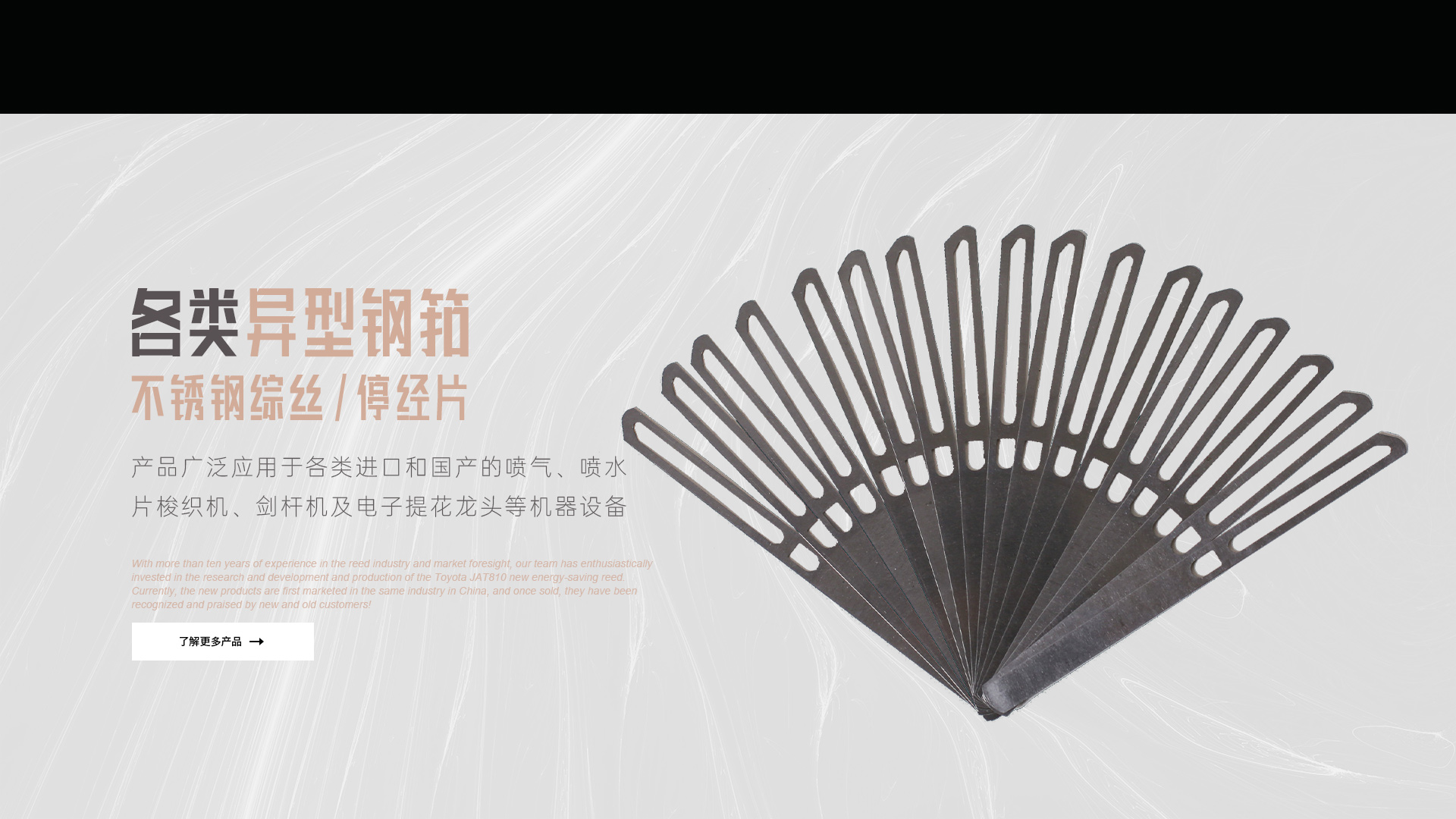 公司主要產(chǎn)品有:噴氣織機用各類異型鋼筘(傳統(tǒng)型豐田JAT710鋼筘及新研發(fā)的豐田JAT810節(jié)能筘);不銹鋼綜絲及不銹鋼停經(jīng)片。我們的產(chǎn)品廣泛應(yīng)用于各類進口和國產(chǎn)的噴氣、噴水、片梭織機、劍桿機及電子提花龍頭等機器設(shè)備。
